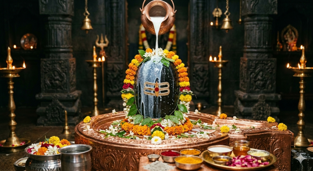 Devotees pour holy substances over the idol or lingam while chanting mantras and hymns, often accompanied by the ringing of bells or conch blowing. -