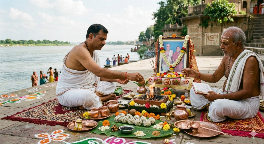 Devotees perform tarpan and offer food, water, and prayers to ancestors for their peace and blessings. -