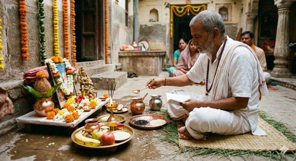 Devotees perform tarpan and offer food, water, and prayers to ancestors for their peace and blessings. -