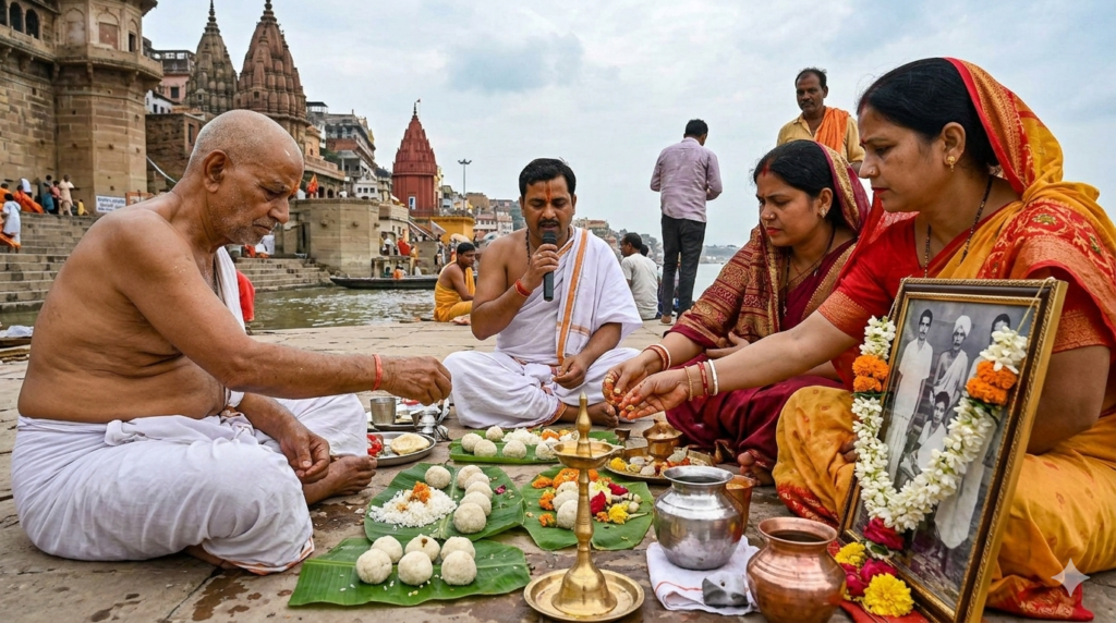 Devotees perform tarpan and offer food and water to ancestors for their peace, happiness, and blessings. -