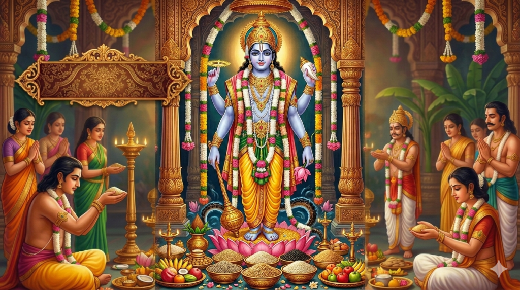 Devotees worship Lord Vishnu to seek blessings for health, prosperity, and purification. -